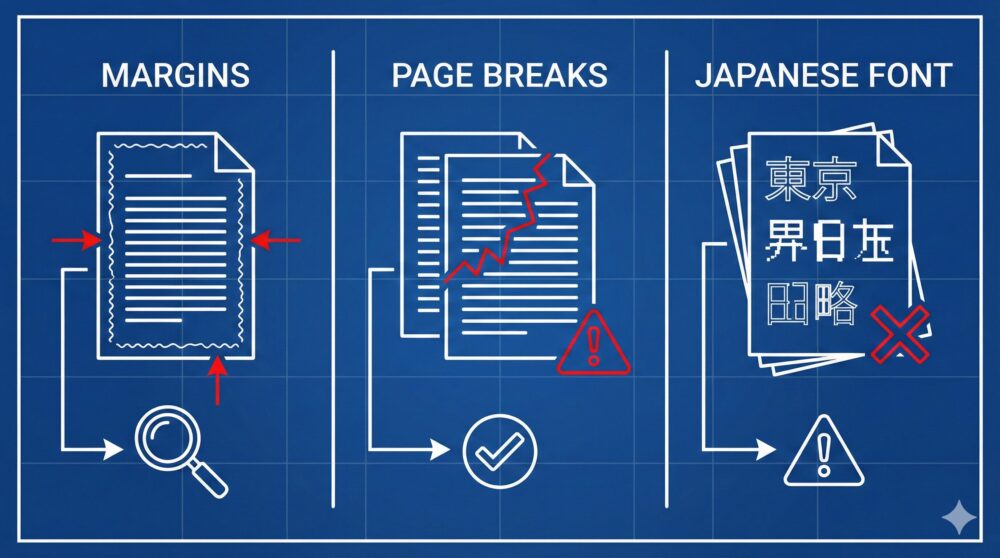 PDFが一回でも崩れていたら、そこで信用が落ちます。だから先にここを詰めました。